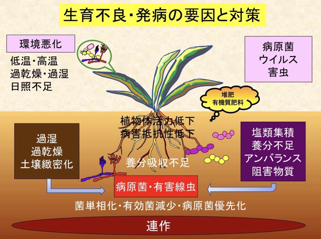生育不良や病虫害発生の要因と対策について下図に示しましたが、低温や高温、過乾燥、過湿、日照不足、病原菌やウイルス、害虫で地上部、地下部が被害を受けて光合成ができず、水分や養分吸収が悪くなり、作物体活力低下、病害抵抗性低下で生育不良となります。