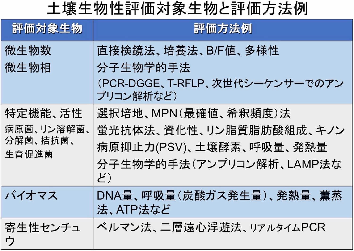 土壌生物性は物理性、化学性に影響され、また物理性、化学性にも大きく影響していますので土壌物理性、化学性、生物性の総合的診断が必要です。土壌生物性評価対象生物と評価方法の例を示しました。