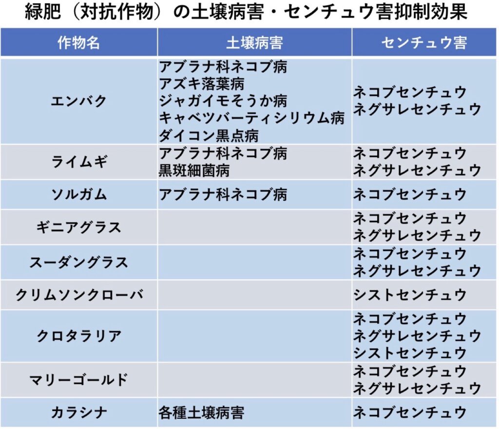 緑肥は病害、センチュウ害抑制だけでなく施肥量削減、有機物供給、土壌物理性改善、土壌生物性改善、雑草抑制、クリーニングクロップとしての効果がありますが、緑肥の種類により効果が異なります。緑肥導入による土つくりの目的を明確にして使用する作物を決める必要があり、特に病害、寄生性センチュウ対策目的の対抗作物は作物名だけでなく品種名での選択が必要で、対象病害、センチュウ害、播種時期、耐寒性、耐暑性、耐酸性、耐湿性、耐雪性、すき込み時期なども考慮して選択することが大切です。マメ科緑肥は窒素固定での窒素供給、エンバクの中にはキスジノミハムシの被害低減の効果も報告されています。緑肥利用では播種からすき込み、分解し次作作付けまでに3ヶ月程度が必要です。緑肥(対抗作物)の種類と土壌病害、寄生性センチュウ害抑制効果について下表に示しました。